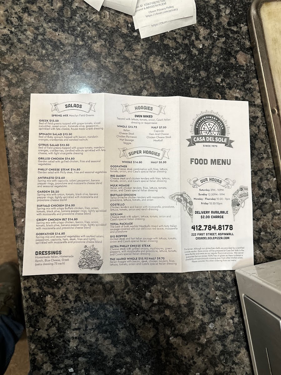 Welcome to Casa Del Sole Pizza, located at 222 1st St, Aspinwall, PA. This beloved local eatery has quickly emerged as a favorite for pizza lovers. The menu boasts creative specialty pizzas, such as the Bianca Pizza featuring roasted garlic sauce, ricotta, and parmesan, and the indulgent Steak Ranchero Pizza, topped with ranch sauce and a blend of cheeses, steak, and bacon. If you crave a kick, try the Spicy Sriracha Chicken Pizza, a delightful mix of grilled chicken and vibrant sriracha.